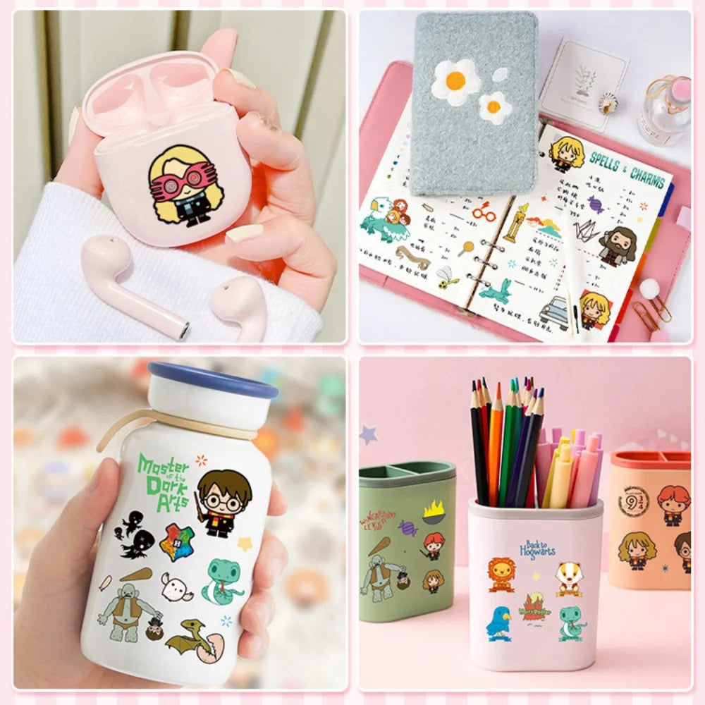 Adorable kawaii designs: Features Hermione, Ronald, Harry, and iconic Wizarding World symbols in a cute anime style